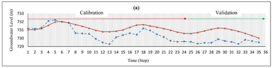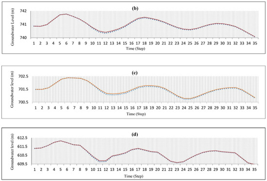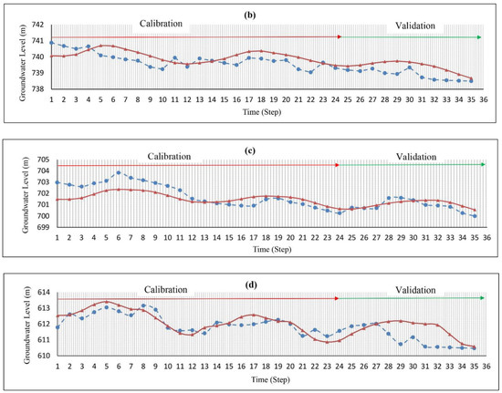 The observed (dash line) and computed (continuous line) groundwater level of well (a) no. 21, (b) no. 2, (c) no. 16, and (d) no. 18.