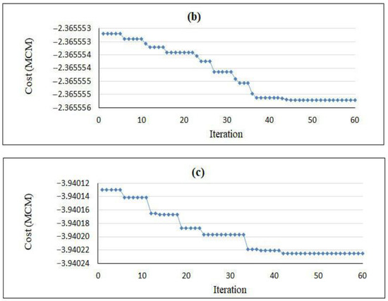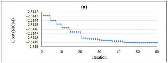 According to the preliminary information in solving the optimization problem for the Yasouj aquifer, groundwater exploitation from the aquifer in the three determined periods is equal to 8.08 MCM, while the amount of artificial recharge is equal to 1 MCM. As a result, the constraint on the amount of exploitation in each period was applied in the optimization model according to Table 7. In order to apply a constraint on the “rate of groundwater level drop” (Equation (6)), the values of hmax were obtained in the determined periods (Table 7), which were defined in the model. Additionally, the relationships obtained from GEP were applied to the optimization model to calculate the groundwater level drop in three determined periods. The objective function was defined in the PSO model, the parameters of which are presented in Table 8. This model was implemented in the MATLAB programming environment, and the convergence of the model during 60 iterations is depicted in Figure 7.