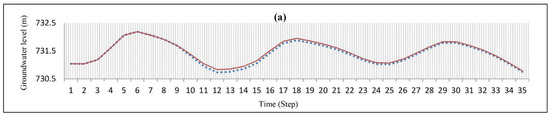 The effects of optimal exploitation (red line) and conventional exploitation (continuous line) on the groundwater level in well (a) no. 21, (b) no. 2, (c) no. 16, and (d) no. 18.