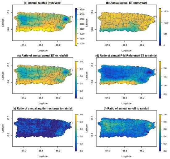 (a) Annual rainfall (mm/year); (b) annual actual ET (mm/year); (c) ratio of annual actual ET to rainfall; (d) ratio of annual Penman–Monteith ETo to rainfall; (e) ratio of annual aquifer recharge to rainfall; and (f) ratio of annual runoff to rainfall for Puerto Rico based on Geostationary Operational Environmental Satellite-Puerto Rico Water and Energy Balance (GOES-PRWEB) data for 2009–2017. The black lines show the location of the municipalities in Puerto Rico.
