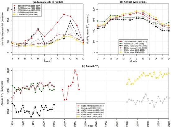 (a) Annual cycle of rainfall (mm/mo.); (b) annual cycle of ETo (mm/mo.); (c) annual ETo (mm/year) from Geostationary Operational Environmental Satellite-Puerto Rico Water and Energy Balance (GOES-PRWEB), Herrera-Ault dataset, and WRF dynamically downscaled climate models at the 2015 irrigated farm locations.
