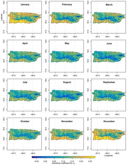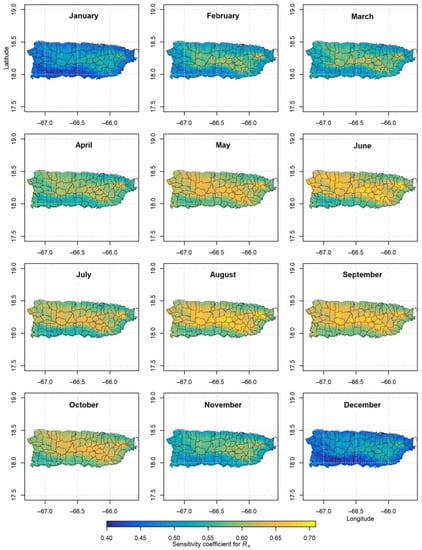 Sensitivity coefficients for ETo, with respect to each of the five basic meteorological variables, were computed analytically and numerically at each GOES-PRWEB grid cell for each day in the period 2009–2017. Maps of the long-term (2009–2017) monthly average sensitivity coefficients derived analytically are shown in Figure 4, Figure 5, Figure 6, Figure 7 and Figure 8. The maps derived numerically for a +/− 5% change in each meteorological variable (not shown) are very similar, corroborating the analytical calculations. The SC for RHmean is negative because an increase in atmospheric water content reduces ETo. To make the SC for RHmean of comparable magnitude to the SC of the other meteorological variables, it is multiplied by −1 in Figure 4. Island wide, ETo is most sensitive to RHmean, followed by Rs, Tmax, Tmin, and , with average absolute relative SCs of 0.98, 0.57, 0.50, 0.27, and 0.12, respectively. This overall ranking of sensitivities is similar to that found by Emeka et al. [] based on relative sensitivities for the tropical rainforest climate of southern Nigeria, where precipitation ranges from 1200 to 3000 mm per year, similar to the range of annual precipitation in Puerto Rico (Figure 2a). The only exception is that in southern Nigeria, ETo was found to be most sensitive to Rs followed by RHmean in the non-monsoon season. The ranking of sensitivities also agrees well with that obtained by Gong et al. [] for the Yangtze River Basin in China, especially during winter when the sensitivity to RHmean is higher than that of Rs and Tmean. Annual precipitation ranges from 400 in the upper Yangtze River Basin to 1600 mm in the lower basin []. Only the middle and lower portions of the Yangtze River Basin have annual precipitation comparable to that of some regions in Puerto Rico (Figure 2a).