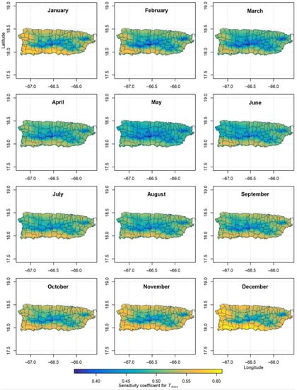 Long-term (2009–2017) monthly average sensitivity coefficients for daily maximum air temperature (Tmax). The black lines show the location of the municipalities in Puerto Rico.