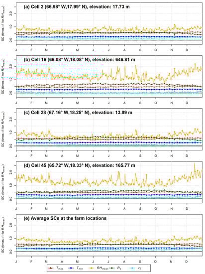 Daily timeseries of sensitivity coefficients (SCs) at: (a–d) representative GOES-PRWEB grid cell locations (Figure 1) and (e) average at grid cells associated with the 2015 irrigated farm locations. Markers are shown every 5 days. Cell 2 is on the southwest coast; cell 16 is located near the Sierra de Cayey; cell 28 is on the west coast; cell 45 is located near the Sierra de Luquillo.