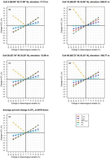 Percentage change in ETo due to +/− 5, 10, 15, 20, and 25% change in basic meteorological variables at: (a–d) representative GOES-PRWEB grid cell locations (Figure 1) and (e) average at grid cells associated with the 2015 irrigated farm locations.