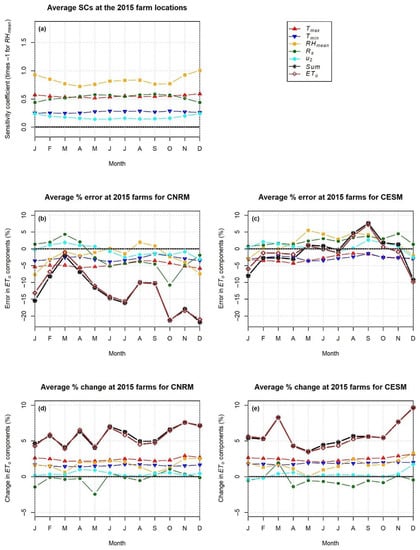 Combining the average SCs at the 2015 irrigated farm locations on a monthly basis (Figure 11a) with the percent error in the simulated basic meteorological variables for the period 1985–2005 with respect to GOES-PRWEB for 2009–2017 according to Equation (3) gives the total contribution of each variable to errors in estimated ETo for the two downscaled GCMs (Figure 11b,c). The individual lines in these plots show the product of the SC for a particular basic meteorological variable times the percent error in the variable, which gives the contribution of that variable to the total error in ETo as a percentage. The brown line shows the total computed error in ETo ( in Equation (3), as a percentage), and the black line shows the sum of the contributions from all the five basic meteorological variables to the total error in ETo ( in Equation (3)). The difference between the black and brown lines is the approximation error (error in Equation (3)). The individual error components add up to large negative monthly biases in ETo of up to −21.1% for CNRM and −12.3% annually. The largest and most consistent contributors to those negative biases appear to be the well-documented [] cold model biases for both Tmax and Tmin. However, biases in all five meteorological variables act synergistically to result in a large underestimation of ETo during October–December in CNRM. Despite ETo being most sensitive to relative errors in RHmean than in the other variables, smaller relative biases in RHmean in CNRM compared to other variables resulted in a smaller contribution of RHmean to errors in ETo.