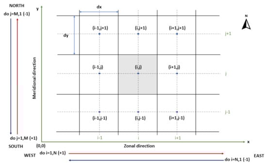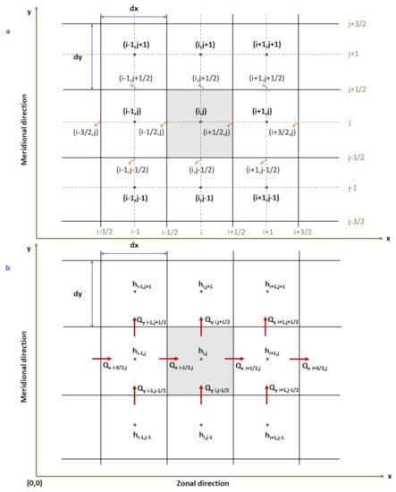 where, V is the volume with Vij referring to cell (i,j), i and j being the x- and y-directions of the Cartesian grid; +1/2 in indexing denotes the intercell positioning of flow parameters; t is the time and dt the timestep of temporal discretization (hence, t’ = t + dt at the following timestep in the solution scheme); Qx and Qy are the volumetric flow rates between adjacent floodplain cells in the zonal x- and meridional y-directions of the Cartesian grid, respectively; Qin and Qout are the incoming and outgoing volumetric flow rates in a typical grid cell within the generic representation of the equations; h is the local floodwater height above each grid cell’s land elevation, z; dx and dy are the cell dimensions in the zonal x- and meridional y-directions of the Cartesian grid, respectively; θ is a numerical weighting coefficient, which determines whether the equations are fully solved or partially implicitly for θ < 1 or explicitly for θ = 1 [58]. The explicit scheme is the norm, but both options are provided in the CoastFLOOD model. Note that the scalar magnitude of local water height, h, is calculated on each cell’s centre or any adjacent cell’s centre, e.g., hi,j or hi+1,j or hi,j−1, while the vectorial magnitude of flow rate, Q, is calculated on either of the side faces of each cell or either of the side faces of any adjacent cell, e.g., Qi−1/2,j or Qi,j+1/2; hence, practically rendering the solution scheme on a staggered grid (Figure 1b).