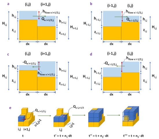 Depiction of flood front propagation over typical grid cells in the CoastFLOOD model’s 2-D x-z plane (graphs (a,b)) and wet/dry cell expansion in pseudo-3-D projection (graph (c)). (a–d) Schematic representation of Qx and hflow, i.e., the flow depth between two adjacent cells, defined as the difference of the highest floodwater surface elevation from MSL zero-level, H, minus the maximum bed elevation, z, between two neighbouring cells either (i,j) and (i + 1,j) in graphs a and c, or (i − 1,j) and (i,j) in graphs (b,d). (e) Illustrative representation of progressive inundation front by discretized floodwater flow propagation and encroachment on an elevating model grid with explicitly modelled micro-topography at arbitrary (n1 − n3 ∙ t) timesteps. Yellow-brown cube-cells refer to ground, while blue ones refer to floodwater.