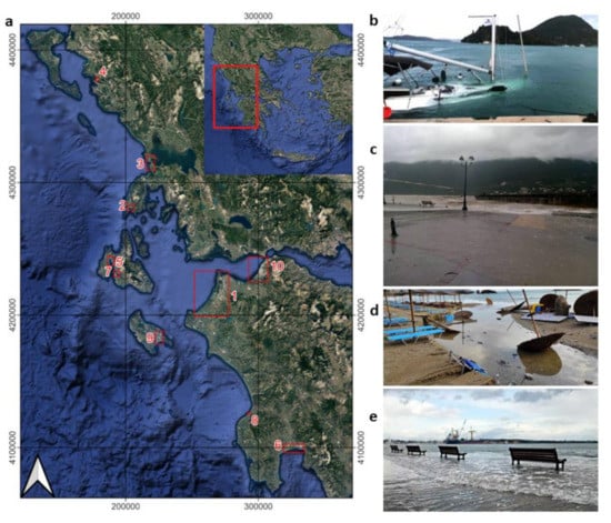 (a) Map of selected study areas to apply the CoastFLOOD model; Areas 1: Manolada-Lechaina, 2: Vassiliki bay, 3: Preveza coastal area, 4: Igoumenitsa port, 5: Livadi bay, 6: Kalamata, 7: Argostoli, 8: Kyparissia, 9: Laganas, 10: Patra city; (b) Depiction of boat wreck due to the passage of Ianos Medicane (September 2020) over Lefkada Island; (c) Storm seawater inundation of November 2017 in Area 2 (Vassiliki, Lefkada Island); (d) impact of “Ballos” (October 2021) storm on a touristic beach on Corfu Island; (e) storm surge coastal inundation at the seafront of Preveza (in November 2021).