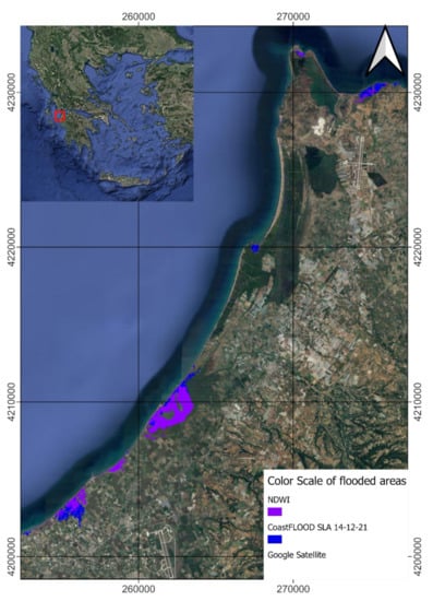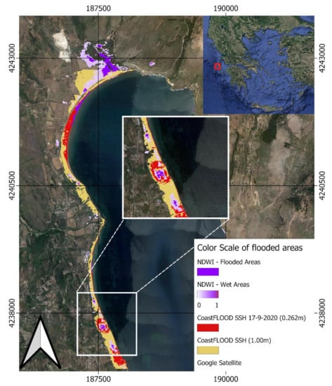The model domains include various urban and suburban settlements, rural coastal plains, environmentally protected areas (lagoons, estuaries, wetlands, and aquatic habitats), touristic infrastructure areas, recreational coastal zones with sandy beaches, and coastal regions accumulating several activities (e.g., aquaculture, fisheries, navigational transportation, seaport commerce, etc.). Coastal inundation hazard maps are produced to estimate the littoral flooding variability over the Greek coastline. Model validation is performed for the operational forecast mode of CoastFLOOD simulations against fine-scale satellite observations (by Sentinel-2 images at 10-m resolution), producing the Normalized Difference Water Index (NDWI) [76,77]. Model results are also compared to a static level, enhanced “bathtub” inundation approach with “eight-side rule” hydraulic connectivity [78,79,80,81,82].