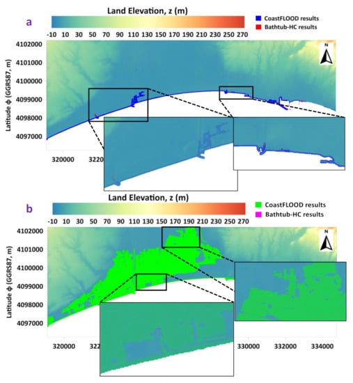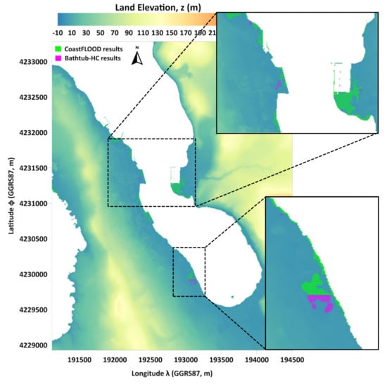 The discrepancies of the DEM/DSM are crucial factors of accuracy in CoastFLOOD simulations of flooded areas, even if the highest available resolution raster grid is used to include topographic details of the natural and urban parts of the coastal domain [93]. CoastFLOOD does not consider the effects of porous bed percolation and ground infiltration, flows in sewerage and drainage systems (e.g., conduits, bridge culverts, wells, shafts, etc.). However, this is not considered a crucial issue, as these constructions are usually saturated with fresh water or drainage/sewage waters from surface runoffs. Coastal inundation usually occurs within a compound flooding incident; i.e., concurrently to river flooding and/or urban flooding due to heavy rainfall and strong runoffs relevant to the storm event also driving the onshore sea surge [37].