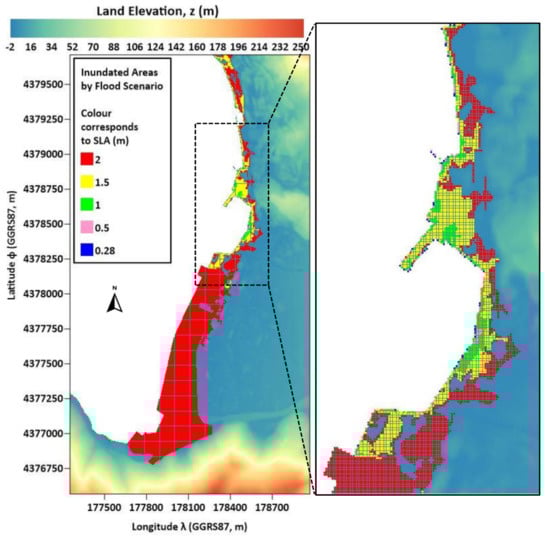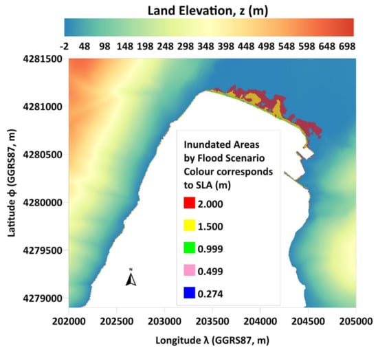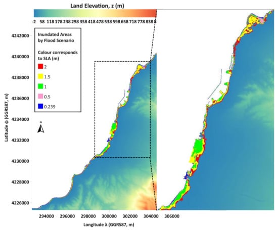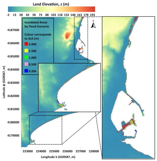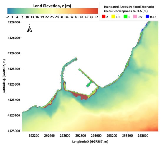 The most prominent natural hazard induced by episodic bursts of SSH or (semi-)permanent long-term MSLR is coastal flooding and/or the inundation of littoral lowlands, with various significant implications for the coastal communities and environments [5]. Several studies have presented investigations of the coastal vulnerability due to the impact of MSLR and storm surges, related flood hazards, and damage assessment in the eastern and western Mediterranean littorals; e.g., Moroccan and Egyptian coasts [6,7,8]; NE Mediterranean coastal zone [9]; Ebro river delta in Spain (NW Mediterranean) [10]; coastal inundation risk assessment due to combined land subsidence and MSLR in southern Italy [11]; estimation of 49 cultural World Heritage Sites in low-lying Mediterranean coastal areas until 2100 [12]; potential MSLR-induced inundation in the central Mediterranean (Malta) for susceptibility assessment and risk assessment scenarios to lead policy action [13]. Hauer et al. [14] assessed the exposure of the U.S. population to coastal flooding due to MSLR, while Kulp and Strauss [15] showed that the latest developments in assessments and error corrections of Digital Elevation Models (DEM) have induced a rise in estimates of global vulnerability to MSLR and related coastal flooding. A robust model implementation for such phenomena producing realistic inundation hazard maps is crucial in terms of coastal management, the study of risk, flood hazard mitigation, first-level response to disaster, and decision support.