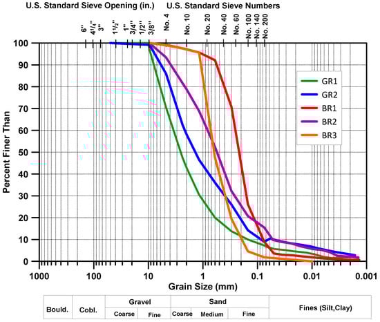 To determine the particle size distribution curve (PSD), the sieve test [] and hydrometer test [] were performed. The PSD of all five substrates is shown in Figure 2. From the PSD, both green roof media contains a large percentage of gravel (>2 mm) in comparison to the bioretention media, which is consistent with the visual inspection done initially. The bioretention materials contain a large percentage of sand (0.05–2 mm), with BR3 having 97% sand. All the substrates analyzed were quite coarse and are expected to have high saturated hydraulic conductivity values leading to good drainage during flooding conditions.