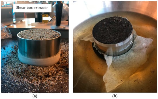 With the exception of the packing procedure, the measurements were made following the procedure as described by the manufacture []. For sample packing, a procedure similar to the one described for the hydraulic conductivity measurements was used. The sample was packed in three lifts. In order to reduce particle segregation during packing, the sample was wetted to a water content of 2%. The first lift is poured into the silver sample ring that is provided with the HYPROP equipment. The sample is compacted with 10 blows using a round shear box extruder and the side of the sample ring is tapped 5 times. The top of the layer was lightly scraped to avoid horizontal layering. Following a similar procedure, the second lift is poured into the sample ring. For the third lift, the excess sample at the top of the sample ring is scraped off with a straight edge (Figure 4a).