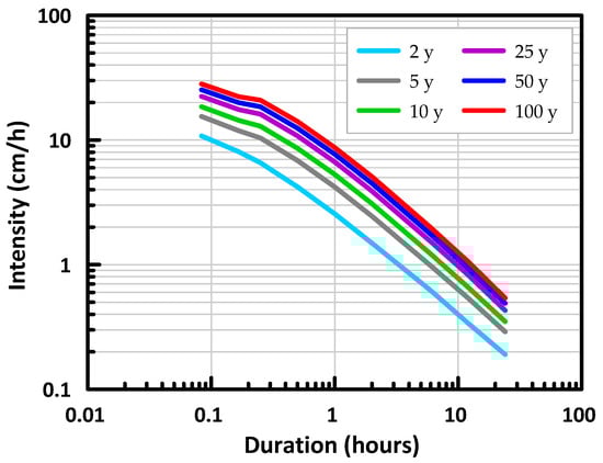 For extreme precipitation events, historical intensity-duration-frequency (IDF) curves were collected from Environment and Climate Change Canada []. Figure 6 presents the IDF curves for Toronto. For this study, the 48-h storm duration was used as it provides meaningful analysis of a greater quantity of water entering the LID system compared to the other storm durations. With the acquired IDF data, synthetic design storms were developed using the method proposed by Kiefer and Chu [], also known as the Chicago design storm.