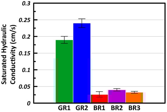 GR1 has a greater percentage of gravel in comparison to GR2, resulting in slightly higher Ks due to the increased void space assisting the water mobility. On the other hand, the bioretention media is designed to undergo ponding and assist in the reduction of storm water pollutants in addition to flood prevention. Thus, to capture the contaminants whether through sorption, volatilization, or filtration, a lower Ks in comparison to the green roof media is preferred [].
