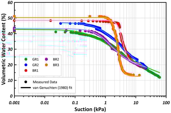 The air entry value (AEV) is the suction value at which air first enters the saturated soil resulting in the start of desaturation. From Figure 9, it can be observed that BR1 and BR3 have a larger AEV compared to the other substrates. From Table 3, the α parameter in the van Genuchten [] equation is approximately equal to the inverse of the AEV. The α parameter is smaller for the bioretention materials in comparison to the green roof materials, with the exception of BR2.