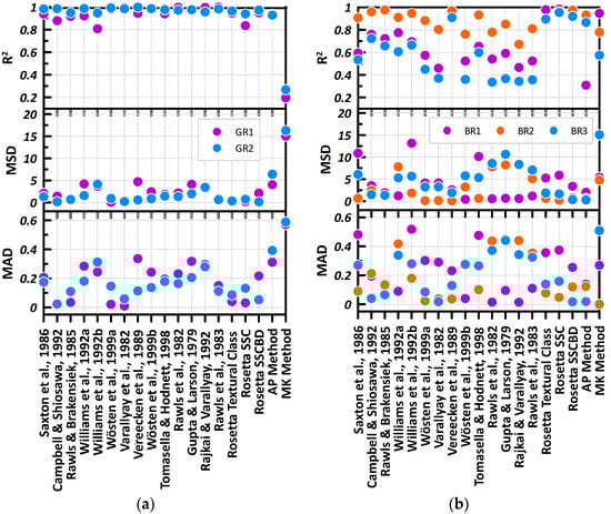 To compare the performance of various PTFs to the measured SWCC, the R2, MSD and MAD values were calculated. Figure 10 presents a scatterplot of the computed R2, MSD, and MAD values for the green roof and bioretention substrates. From Figure 10, it can be observed that the trend relative magnitudes are captured well for both green roof substrates in comparison to the bioretention substrates. On average, both of the green roof substrates (GR1 & GR2) have an R2 value greater than 0.90, with the exception to the MK method that had an R2 value less than 0.30. Whereas the bioretention substrates have low R2 values, in some cases reaching a low R2 value of 0.30. In addition, there is a lower deviation observed between the measured and predicted SWCC for the green roof substrates in comparison to the bioretention substrates. The MSD value for the green roof substrates generally have a value less than 4, with an average of 1.8 without the MK method. Whereas the bioretention substrates have MSD values exceeding 10, with an average of 3.9. The MAD estimation, as stated earlier, presents a more direct measure of the data where a value of 0.5 means that the volumetric water content of the predicted model is, on average, off by 0.5 from the mean of the measured data. As shown in Figure 10, the bioretention substrates presents a larger deviation in MAD and MSD values compared to the green roof substrates. A visual examination is required to assess where the predictions are most problematic.