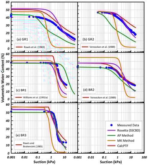 Predicted versus measured SWCC for selected PTFs for (a) GR1, (b) GR2, (c) BR1, (d) BR2, and (e) BR3. [,,,].