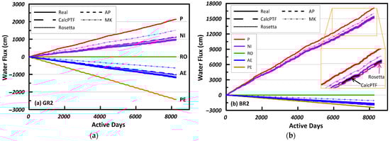 The impact of measured versus predicted hydraulic properties on the performance prediction of LID systems was assessed using HYDRUS 1D software []. HYDRUS is a modelling software used in the analysis of water flow and solute transport in variably saturated soils. Various studies have demonstrated that HYDRUS provides good accuracy in predicting the hydraulic response of different LID systems [,,,,]. In order to set-up the numerical model, the material properties, climate data, geometry, initial conditions and boundary conditions are required. The material properties used for the analysis are the measured soil properties and the predicted van Genuchten [] parameters from the PTFs.