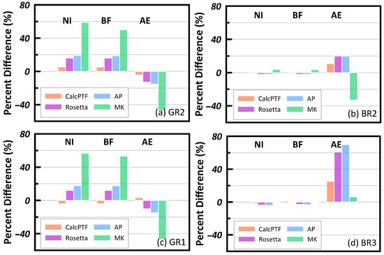 From Figure 11, it can be observed that the predicted curves capture the slope of the measured SWCC fairly well. The predicted curves for BR2, GR1 and GR2 follow a gradual sloped curved, with some exceptions such as the MK method. Whereas the measured SWCCs for BR1 and BR3 have steep SWCCs which is indicative of the fact these materials drain over a narrow suction range compared to the other measured SWCCs. The predicted curves for BR1 and BR3 present a steep SWCC, similar to the measured SWCCs. Thus, the slopes of the predicted curves presents a good fit to the measured curves. The AEV of the predicted SWCCs rarely overlap with the measured AEV, as shown in Figure 11. Predicted curves that underestimate the AEV present a relatively better fit compared to the predicted curves that overestimate the AEV. For example, the AP method presented in Figure 11c for BR1 overestimates the AEV, leading to an extremely poor fit. Choosing a PTF that overestimates the AEV wrongfully estimates the substrate’s ability to stay completely saturated over a greater suction period and would result in erroneous designs.