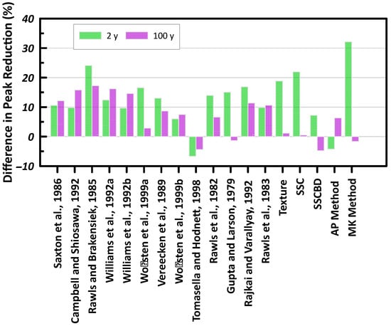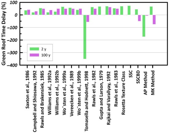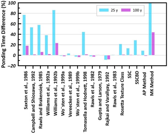 Ponding time percent difference between measured and predicted hydraulic properties [,,,,,,,,,,,,,,].