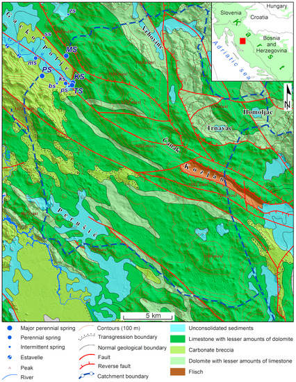 - Lukač Reberski, J.; Marković, T.; Nakić, Z. Definition of the river Gacka springs subcatchment areas on the basis of hydrogeological parameters. Geol. Croat. 2013, 66, 39–53. [Google Scholar] [CrossRef]