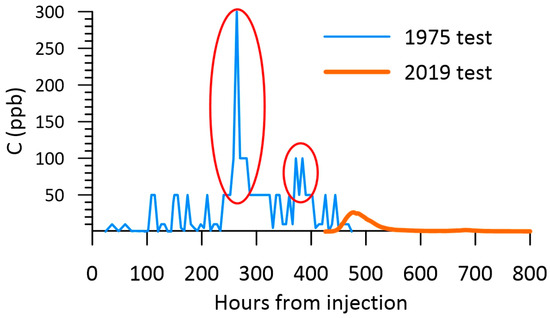 Comparison of the tracer breakthrough curves on MSs during tracing in Vrhovine polje in 1975 and 2019 (1975 concentrations were estimated visually, and we rated only parts of the curve marked with red circles as reliable tracer detections).