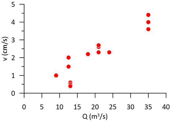 Table 1 shows the results with selected parameters of all tracer tests performed in the Gacka River watershed until today. There have been 12 tracing tests with 28 determined groundwater connections. After analyzing and rejecting some unreliable tracer detections, we estimated 21 groundwater connections as reliable. In most tests, the tracer was injected in active ponors, while once the tracer was injected in an observational borehole near Perušić polje, once in the crack widened through corrosion in the quarry located near the hinterland of the springs, and once in the solutional opening in the rocky bottom of the doline near Perušić polje. After the injections at locations that were not active ponors, the tracer was additionally flushed with several tens of cubic meters of water. After rejecting unreliable results, all apparent flow velocities (both to first tracer arrival and peak concentration) were within the range of 0.2–4.4 cm/s, with a mean value of 1.7 and a median value of 1.3 cm/s. Apparent groundwater flow velocities are well correlated to concurrent Gacka River flows, i.e., with hydrological conditions by faster velocities in wetter periods (Figure 4). It should be noted that all tracing tests were done in moderate to high-flow conditions, so apparent groundwater flow velocities during low-flow conditions are probably significantly lower, i.e., below 0.1 cm/s. Generally, flow velocities can vary by even two orders of magnitude depending on the hydrological conditions in the karst conduits. The arrival of the tracer is often pushed during, or soon after, hydrograph peaks, so besides average flow conditions, flow dynamics after the injection also considerably affect tracer arrival time (continuous flow recession vs. flood event after the injection). On the other hand, there are no significant differences in apparent groundwater flow velocities between injections into active ponors and a few injections into other types of objects (Table 1), which is probably due to the selection of highly permeable locations and the washout of the tracer by a significant amount of water after injection.