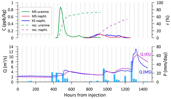 The monitoring of the tracers was established at all active springs of the Gacka River. Four main sources (MS, KS, TS, and PS) were equipped with field fluorimeter loggers GGUN FL-30 by Abillia Sarl. The loggers enabled continuous tracer concentration monitoring as well as the monitoring of turbidity, which can affect tracer determination. In addition to the field fluorimeters, samples were also manually collected at all monitored springs. Tracer detection and concentration in the samples were determined in the laboratory on a Perkin-Elmer LS 55 fluorescence spectrophotometer. Besides the detection of the tracer arrival on minor springs, laboratory measurements also served for the control of the field fluorimeter measurements on the main springs. Blank samples were also taken before tracer injection in order to determine the fluorescence background of the spring water. Due to the relatively high background of the Gacka spring water, which is a consequence of the intense vegetation in the springs, the estimated minimum tracer concentration for reliable detection with the laboratory spectrophotometer was 0.01 ppb for uranine and 0.1 ppb for Na-naphthionate, and with the field fluorimeter approximately 0.2 ppb for uranine and 1 ppb for Na-naphthionate. Field fluorimeters measured tracer concentration every 15 min during the complete monitoring period. Water samples were collected twice daily during the first 20 days from the tracer injection, followed by once (or twice daily depending on hydrological conditions) afterward. Field fluorimeter concentration readings were additionally calibrated and adjusted to the values determined using a laboratory spectrophotometer. Monitoring finished 70 days after the injection, when tracer concentrations on all the springs were below the background.