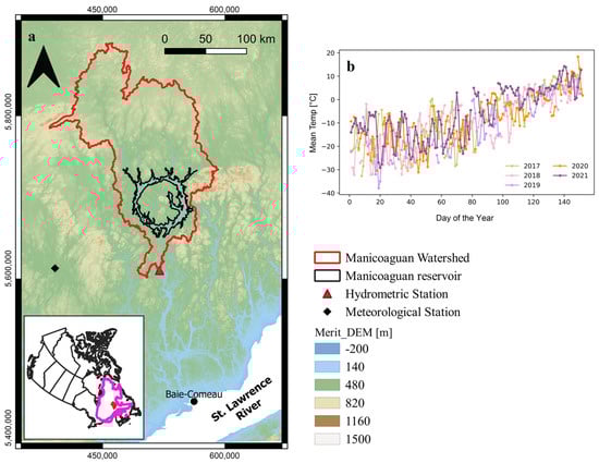 (a) Location of the Manicouagan reservoir within the Manicouagan watershed. The hydrometric station is located at the position of the Daniel-Johnson dam (Manic-5), the power station and the spillway of Manic-5. The study area is situated in Quebec province (contour in pink), eastern Canada. (b) Time series from the meteorological station from January to May over five years (2017 to 2021) are depicted.