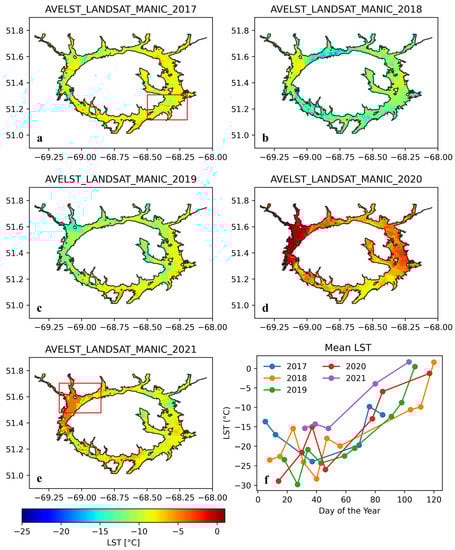 Spatiotemporal evolution of land surface temperatures from Landsat and MODIS was studied over the Manicouagan reservoir for the winter seasons from 2017 to 2021. Although time series from both MODIS and Landsat indicate increasing LSTs as the winter advances, the latter present important gaps due to, for example, cloud filtering. Therefore, the important LST jumps observed in the MODIS LST time series are not captured by the Landsat series. Important fluctuations in the MODIS time series are principally observed at the beginning and the end of the winter, which could be linked to changes in the ice coverage state (initial formation and decay, respectively). From the hydrometric station, important air temperature variations are also noted at several moments of each winter period (Figure 1). Note that this station is located at more than 100 km from the reservoir; thus, variations might not precisely reflect the conditions over the reservoir. According to the records of this station, the hottest winter was that of 2021 (mean temperature of −13 °C), followed by the winter of 2020 with a mean air temperature of −15 °C. These observations agree with those derived from the mean LST satellite-based time series (Figure 2f and Figure 3f) and from the ERA5-land data. In general, temperatures for the yearly winter periods of study from both sensors are similar. For the five winter periods of study, the average variation of temperature in the case of MODIS is 25 °C, whereas, in the case of Landsat, it is around 28°C.