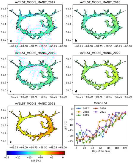 Land surface temperature (LST) over the Manicouagan reservoir from MODIS and Landsat imagery are visualized in Figure 2 and Figure 3, respectively. Specifically, Figure 2a–d and Figure 3a–d show maps of mean Landsat and MODIS LST, respectively, for the different winters under study. Mean daily LST time series from MODIS and Landsat are depicted in Figure 2f and Figure 3f, respectively. Spatially, the LSTs from both sensors vary over the reservoir for each winter. The concentration of high/low-temperature patches is observed, with their location changing from one winter to another. Landsat LSTs vary between −28 °C in January and near or slightly above 0 °C at the end of April. In the case of MODIS (Figure 3), a smoother spatial distribution of LST is observed for each winter, and LSTs vary on average from −25 °C to 0 °C from January to April.