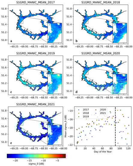 The spatiotemporal analysis of Sentinel-1 backscattering coefficients over Manicouagan reservoir are also evaluated (Figure 4). As observed from the 5-year winter period of analysis, overall, the radar backscattering coefficients increase as the winter advances from January to April, when a notable decay is observed (beginning of break-up). Specifically, the radar backscattering coefficient over the entire reservoir varies on average between −19 dB at the beginning of the winter and −15 dB at the end of March. At this moment, temperatures start to notably increase, being above or near 0 °C. Previous studies over Canadian lakes have reported similar trends of the break-up dates for longer periods of analysis (e.g., []). Possibly, the early break-up date observed may be caused by a combined effect of changes in temperature, snow cover and wind conditions (e.g., []).