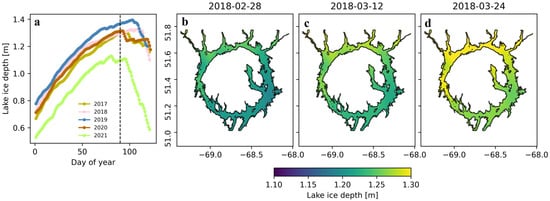 (a) Evolution of the reservoir ice depth (ice thickness) as estimated from ERA5-Land from January to April. The vertical dash indicates the date when, in general, ice thickness starts to decay, and it is also defined considering Figure 4f. Examples of spatial distribution of ice depth (thickness) for the dates of use in the interferogram formation are shown in panels (b–d).