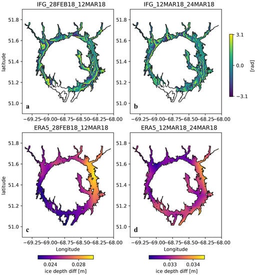 D-InSAR maps of surface change for the winter of 2018 (a,b). (c,d) Maps of ERA5-land ice thickness differences estimated for the same dates used in the interferograms in panels (a,b).