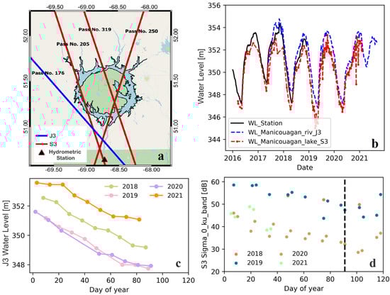 Altimetric data from Sentinel-3 and Jason-3 were requested from the Centre de Topographie des Océans et de l’Hydrosphère (CTOH) at LEGOS (Laboratoire d’études en Géophysique et océanographie spatiales). The altimetric data were post-processed using the Altis software []. To interpret and evaluate the quality of the surface height from these altimeters, they were compared to the available records of water levels from a hydrometric station (see Figure 1a). The evolution of radar backscattering values from the Ku-band of Sentinel-3 was also evaluated.