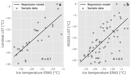 (a) Comparison of mean Landsat LST and mean ice surface temperature from ERA 5-land. (b) Comparison of mean MODIS LST and mean ice surface temperature from ERA 5-land.