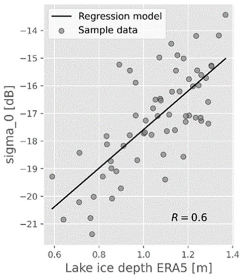 The radar backscattering values were also compared to the ice thickness values from ERA 5-land to evaluate a possible relationship between these two variables (Figure 10). A relatively good correlation(R) of 0.6 was found for the 5-year winter periods of analysis. These results agree with those from existing studies, which suggest that ice growth is linked to an increase in radar backscattering values independent of the format of air inclusions (e.g., [,]). The value of the correlation obtained indicates that ice growth could be approximately modeled linearly as a function of the radar backscattering coefficient; nevertheless, a longer time series of datasets needs to be evaluated to conclude the relationship of these variables and to propose a model that could be used for forecasting purposes and the calibration of physical lake ice models.