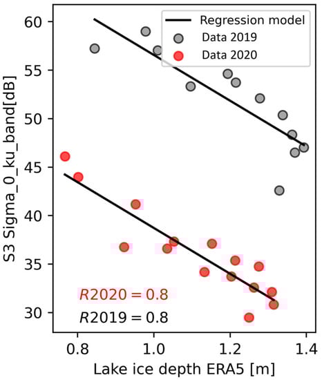 Sentinel 3 Ku-band radar backscattering coefficient versus lake ice depth from ERA5-land for 2019 and 2020.