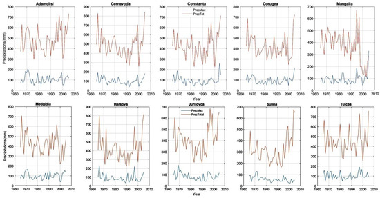 The sets consist of the minimum, maximum, and total annual precipitation and minimum, maximum, and average annual temperature series recorded for 41 years at the main meteorological series (whose names are on the map from Figure 1) in Dobrogea. The maximum and total annual precipitation series (PrecMax and PrecTot) are represented in Figure 2.