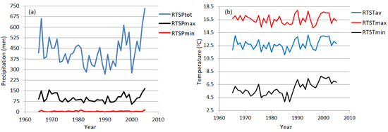 To compute RTSs, first, the optimum number of clusters was determined to be k = 2. Then, the algorithm was run with k = 2 for each series set—PrecTot, PrecMax, PrecAv, TempTot, TempMax, and TempAv. The charts of the RTSs can be seen in Figure 5.