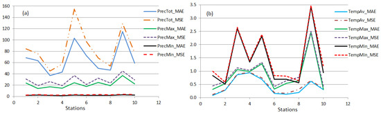 The average MAEs and MSEs at each station with respect to RTSs for (a) Precipitation, and (b) Temperature.