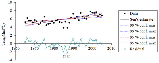 The Mann–Kendall test rejected the null hypothesis, at a significance level of 0.05, only for RTSTmin. Applying Sen’s procedure to the mentioned series, a slope of the linear trend equal to 0.053 was found. The graphical representation of the RTSTmin (the black dots), the regression line (black), the limits of the confidence interval (dotted lines, blue and red), and the residual in the linear model is represented in Figure 7.