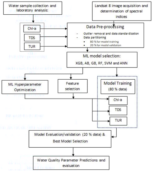 The following supporting information can be downloaded at: https://www.mdpi.com/article/10.3390/hydrology10050110/s1, Figure S1: AdaBoost number of estimator tuning for Chl-atitle; Figure S2: AdaBoost learning rate tuning for Chl-a; Figure S3: Random Forest maximum depth tuning for Chl-a; Figure S4: Random Forest number of estimator tuning for Chl-a; Figure S5: SVR c regularization tuning for Chl-a; Figure S6: SVR gamma tuning for Chl-a; Figure S7: XGBoost learning rate tuning for Chl-a; Figure S8: XGBoost maximum depth tuning for Chl-a; Figure S9: GradBoost number of estimator tuning result for Chl-a; Figure S10: XGBoost learning rate tuning for Chl-a; Figure S11: GradBoost number of estimator tuning for Chl-a; Figure S12: GradBoost maximum depth tuning for Chl-a; Figure S13: AdaBoost learning rate tuning for TDS; Figure S14: AdaBoost number of estimator tuning for TDS; Figure S15: GradBoost learning rate tuning for TDS; Figure S16: GradBoost maximum depth tuning for TDS; Figure S17: GradBoost number of estimator tuning for TDS; Figure S18: Random Forest maximum depth tuning for TDS; Figure S19: Random Forest number of estimator tuning for TDS; Figure S20: SVR c regularization tuning for TDS; Figure S21: SVR gamma tuning for TDS; Figure S22: XGBoost learning rate tuning for TDS; Figure S23: XGBoost maximum depth tuning for TDS; Figure S24: XGBoost number of estimator tuning for TDS; Figure S25: AdaBoost learning rate tuning for TUR; Figure S26: GradBoost number of estimator tuning for TUR; Figure S27: Random Forest number of estimator tuning for TUR; Figure S28: Random Forest maximum depth tuning for TUR; Figure S29: SVR c regularization tuning for TUR; Figure S30: SVRgamma tuning for TUR; Figure S31: XGBoost learning rate tuning for TUR; Figure S32: XGBoost maximum depth tuning for TUR; Figure S33: XGBoost number of estimator tuning for TUR; Figure S34: GradBoost learning rate tuning for TUR; Figure S35: GradBoost maximum depth tuning for TUR; Figure S36: GradBoost number of estimator tuning for TUR; Table S1: Water indices as features derived from Landsat 8 OLI used in the study.