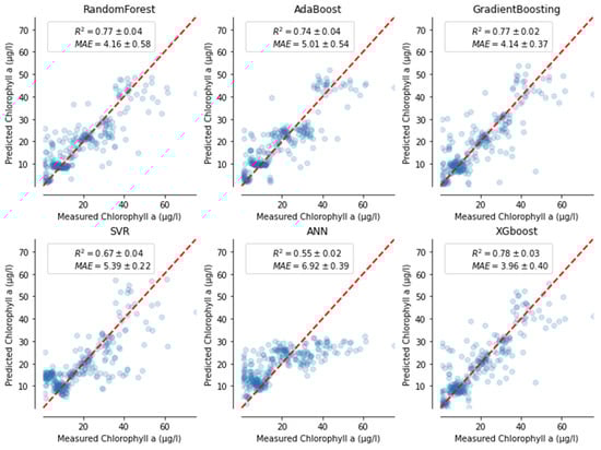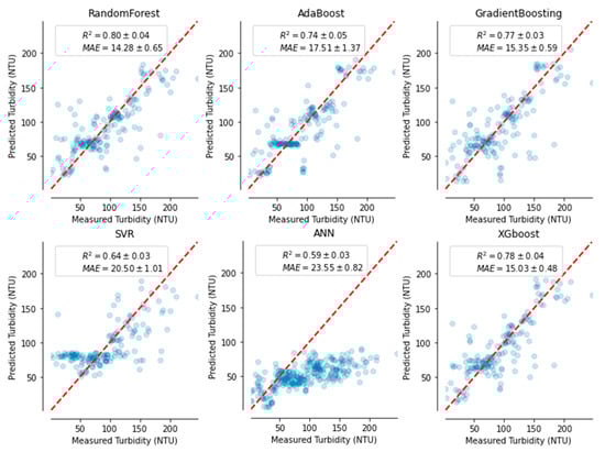 The performance metrics using Equations (1)–(4) for each model are shown in Table 3 for Chl-a, TDS, and TUR. Although XGB, RF, and AB had a very close value of R2, their NSE values vary slightly. Figure 3, Figure 4 and Figure 5 are scatter plots of the measured and predicted water quality parameters of Chl-a, TDS, and TUR, respectively, for the test dataset. The performance metrics result of the ML models for Chl-a with the test dataset showed good performance except for ANN (Figure 3). Although XGB, RF, and AB had a very close value of R2, their NSE values vary slightly. XGB performed best at capturing the relationship of Chl-a and the remote sensing image, with an R2 of 0.78, NSE of 0.78, MARE of 0.082, and RMSE of 9.79 µg/L. GB was the second-best performing algorithm, with an R2 of 0.77, NSE of 0.78, MARE of 0.091, and RMSE of 5.85 mg/L. RF’s performance was third best with similar performance metrics, followed by AB and SVM. The lowest performing ML algorithm for predicting Chl-a was ANN, with an R2 of 0.55, NSE of 0.056, MARE of 0.124, and RMSE of 7.14 µg/L.