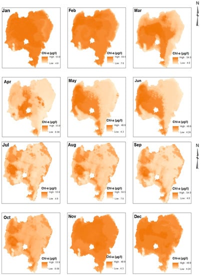 The mean Chl-a concentration of the lake from the observed data was below 20.6 µg/L in all years (Table 1). The most recent Chl-a concentrations were 7 µg/L in October, 2021, and 9 µg/L in April, 2022. These observed Chl-a were similar to measurements by Dersseh et al. [] in order of magnitude; however, the observed Chl-a concentration in December, 2016 (17 µg/L) and March, 2017 (21 µg/L) were different from the measurements by Dersseh et al. [] in 2019 and 2020.