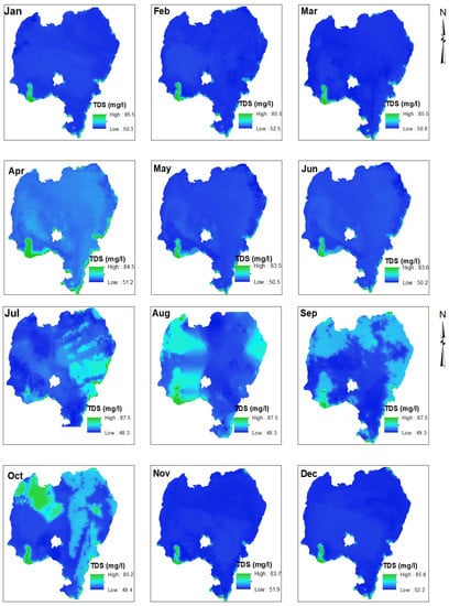 It used the following features, B1, B3, B4, B6, B10, B11, GNDVI_3, GNDVI_4, MNDWI_2, TWI_2, Gossan, I, MVI, AWEInsh, (B4 + B3)/2, (B4 + B2)/2, (B3 + B2)/2, (B2 + B3 + B4)/3, to perform the prediction (Table 2). Spatial monthly variations of TDS concentrations were highest in the main rainy season of July, August, and September. The predictions showed high concentrations of TDS in the green-colored areas, especially around the Gilgel Abay River in the southwest. These predicted spatial patterns seem to accurately reflect Gilgel Abay’s role as a major source of sediment in the lake [].