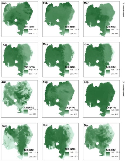 Monthly TUR (NTU) spatial variation predicted by RF regression algorithm for 2017.