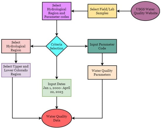 For this study, in situ water quality data were obtained from the USGS data repository for the river stations from 1 January 2000 to 22 April 2023. The data were retrieved from the USGS website []. A search was conducted for the WQPs (field/lab sample data) on the USGS data repository by inputting parameter codes (70301 for TDSs and 80154 for TSSs) for the water quality parameters under consideration for the upper and lower basin hydrological regions as presented in Figure 2. The parameter codes were obtained from the USGS website. The summary approach utilized in the data retrieval is presented in Figure 2. The approximate location, drainage area, and states of the stations with the data for this study are presented in Table 1 and further illustrated in Figure 3. The river and tributary shapefile, the basin boundary, and its reservoir storage data were retrieved from the CRB GIS Open Data Portal []. A summary of the data availability and period for the station is presented in Table 2.
